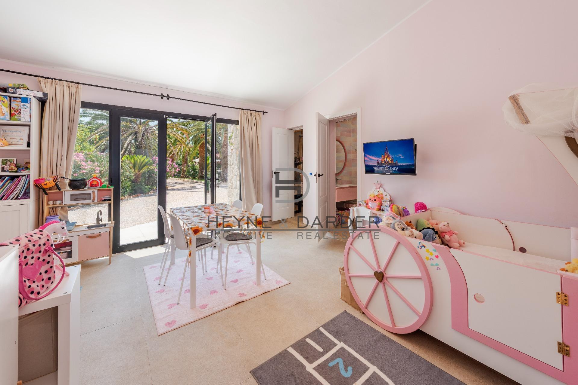 Die Immobilie bietet ca. 336 m² Wohnfläche und eine Gesamtbebauung von rund 470 m², verteilt auf drei unabhängige Gebäude. Das Haupthaus erstreckt sich über zwei Etagen und vereint offene Räume, viel Tageslicht und traditionellen mallorquinischen Charakter. Es verfügt über eine integrierte Küche mit Essbereich, ein helles Wohnzimmer mit Kamin, Schlafzimmer im Erdgeschoss sowie weitere Räume im Obergeschoss mit Zugang zu einer Terrasse mit Panoramablick.
