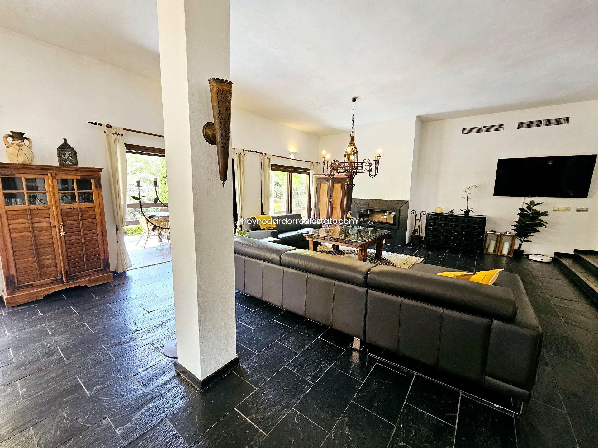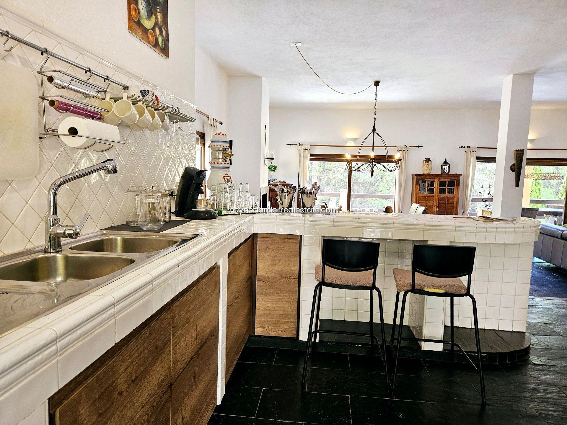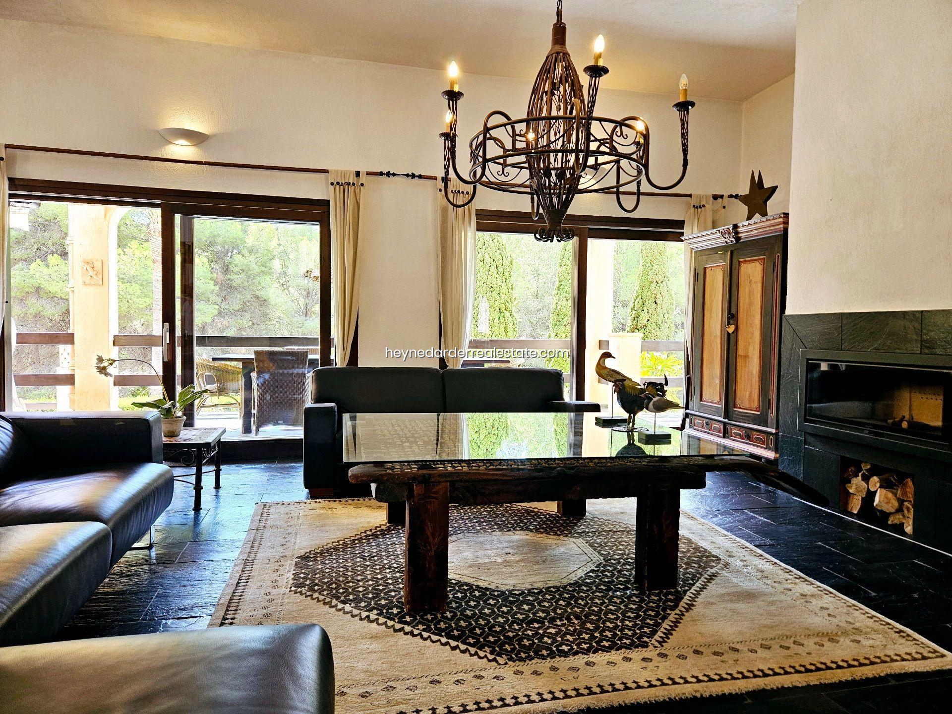 The spacious living room with high ceilings and large windows offers a bright and welcoming ambience, complemented by two fireplaces for warmth in the winter months. The upper floor houses the luxurious master suite with dressing room and private bathroom, while two additional bedrooms share a bathroom. All rooms have direct access to spacious terraces, perfect for enjoying the sun and panoramic views.