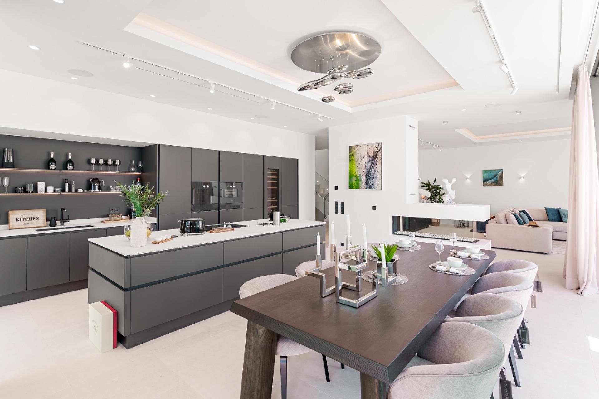 The exterior of the villa is a true Mediterranean oasis. The infinity pool visually merges with the deep blue of Cala Llamp, creating a perfect setting for moments of relaxation and contemplation. The outdoor living areas and the fully equipped exterior kitchen allow you to enjoy the Mallorcan climate and host social gatherings in an atmosphere of absolute privacy. The integration between indoor and outdoor spaces has been carefully designed to ensure comfort and harmony at any time of year.