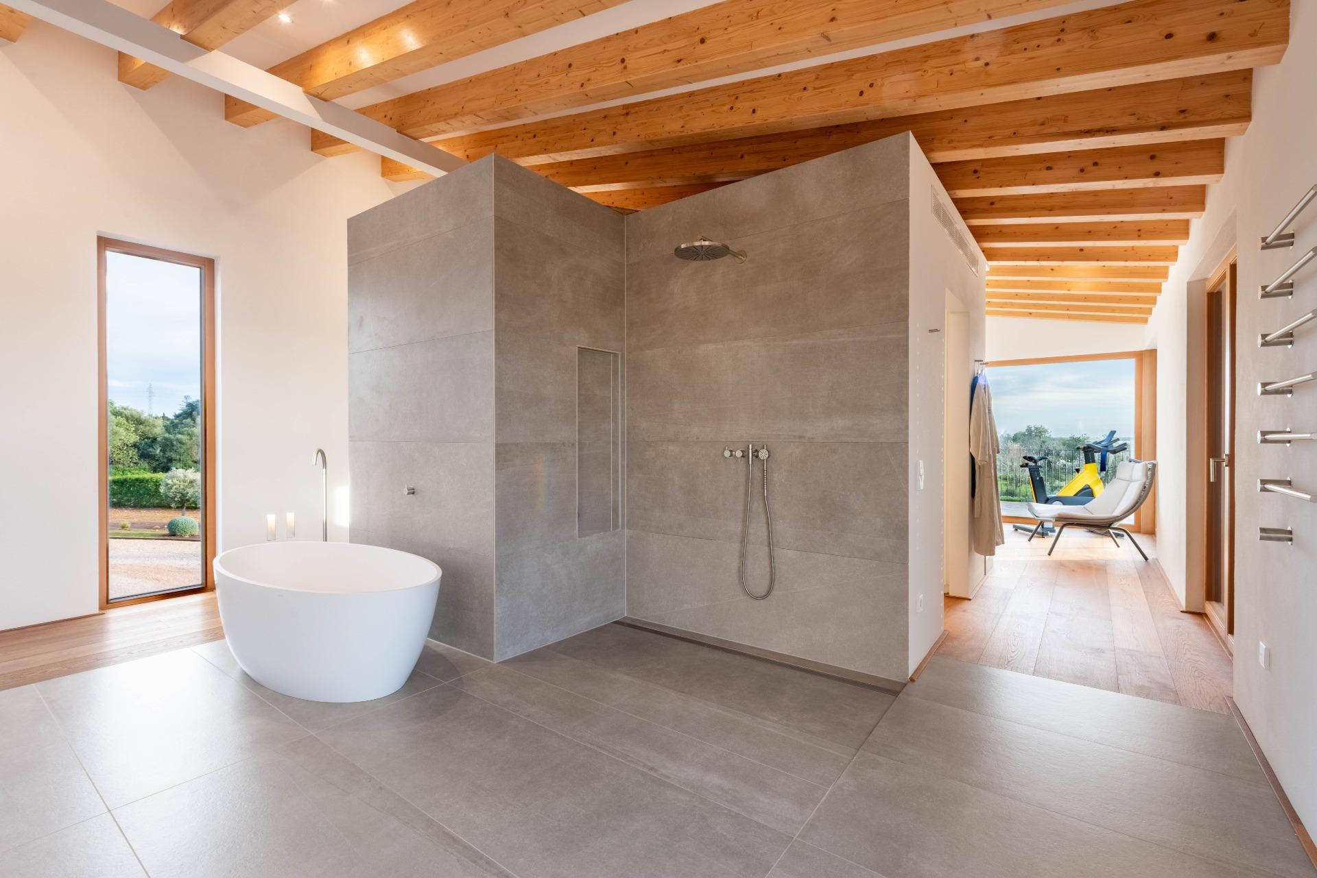 The property is distributed over ground floor and first floor and has been designed to offer high comfort both for everyday living and extended stays. On the ground floor there is the main kitchen and a separate preparation kitchen, connected to a spacious living-dining area that serves as the central hub of the home. This level also includes a guest toilet, laundry room and several bedrooms, including one bedroom with en-suite bathroom that can also function as an office, as well as additional bedrooms for family members or guests, allowing great flexibility of use.