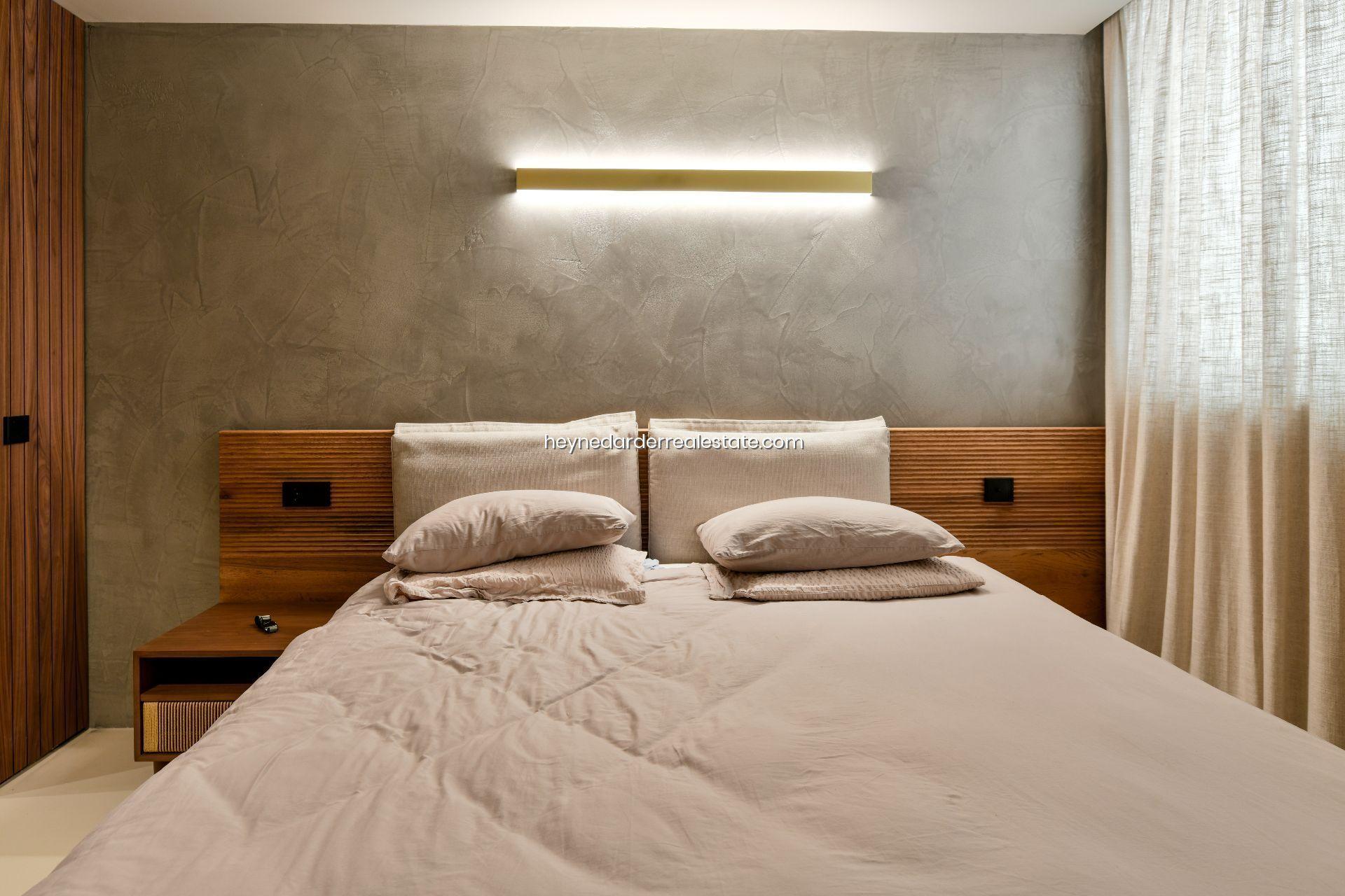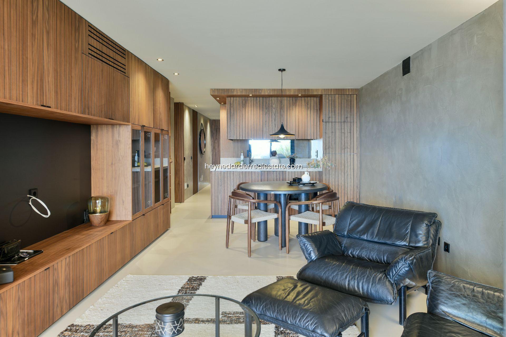 La propiedad ha sido recientemente reformada con materiales de alta calidad y ofrece una superficie construida aproximada de 127 m². La distribución incluye un amplio salón-comedor con cocina de concepto abierto totalmente equipada, que se abre a una generosa terraza soleada con vistas despejadas. Dispone de dos dormitorios con baños en suite y un aseo de cortesía adicional. Se entrega completamente amueblado y equipado, incluyendo suelos de microcemento o baldosas de alta gama, aire acondicionado y ventanas con doble acristalamiento.