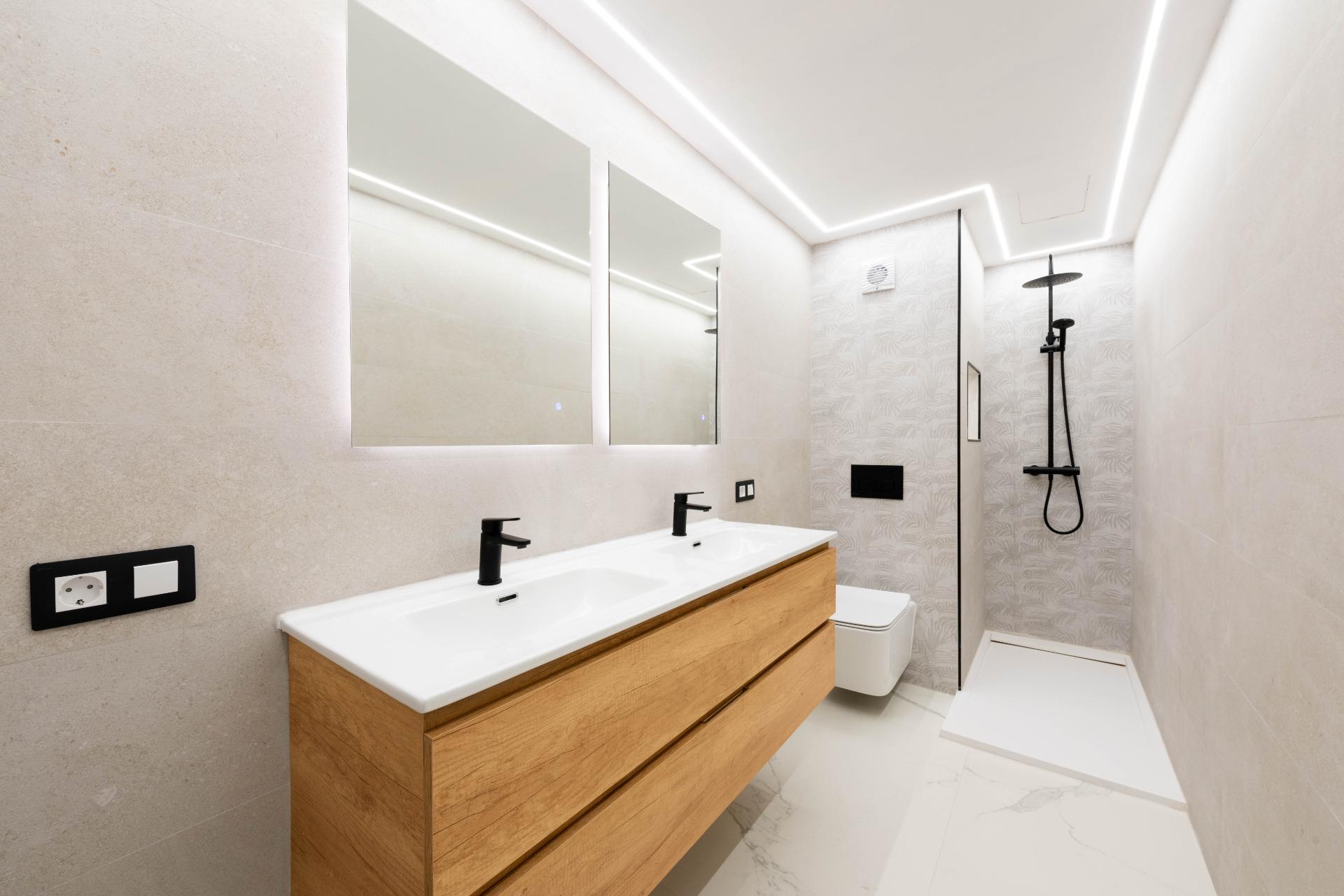 La vivienda ha sido cuidadosamente actualizada para ofrecer un ambiente moderno y funcional. El salón-comedor, amplio y luminoso, conecta con la cocina equipada con electrodomésticos Bosch y acabados de diseño que elevan la experiencia del día a día. Los suelos claros, la iluminación led en diferentes estancias y los materiales seleccionados con criterio aportan frescura y sofisticación a cada rincón.