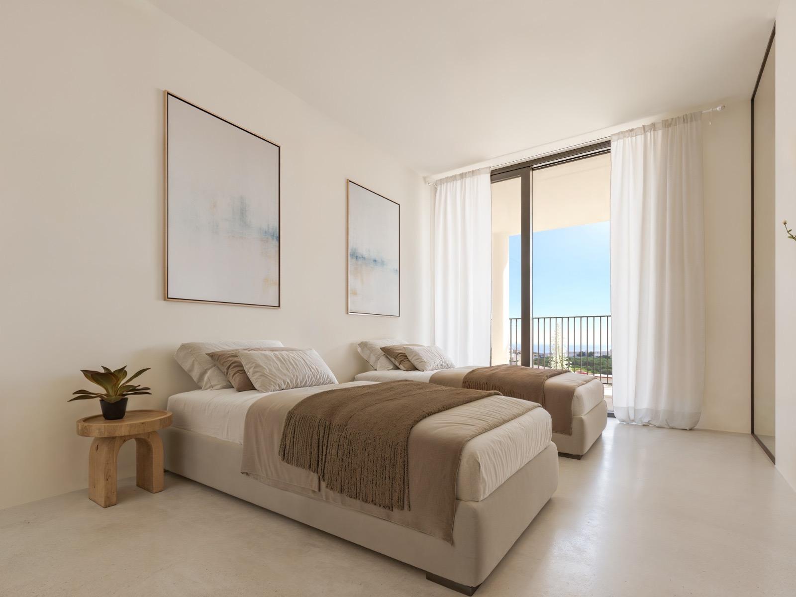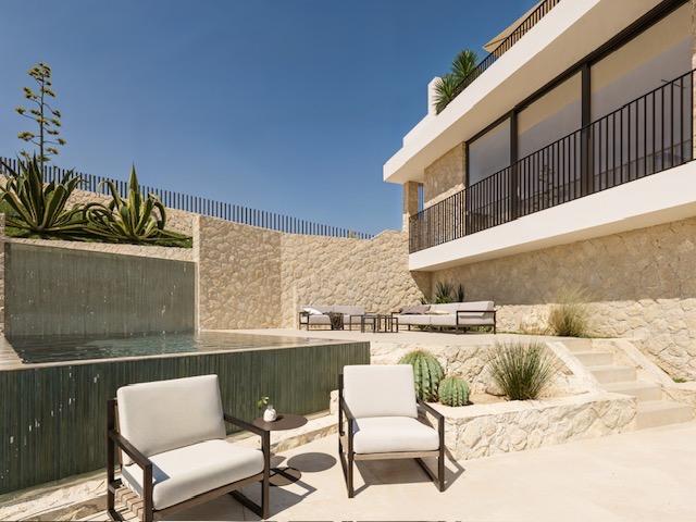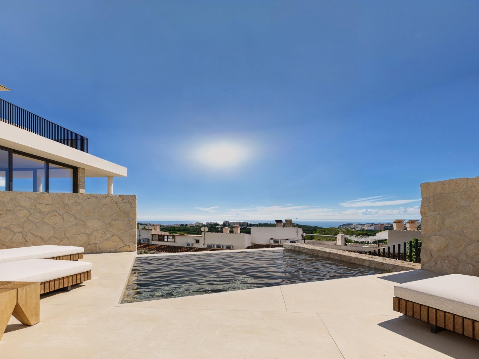 La villa se concibe para vivir el exterior durante todo el año. Dispone de zonas ajardinadas, terrazas panorámicas y una espectacular piscina a dos niveles con cascada, que se integra de forma natural en el diseño del conjunto. En la cubierta, una azotea con vistas abiertas al mar se convierte en un espacio privilegiado para relajarse, disfrutar del entorno y contemplar el paisaje mediterráneo.