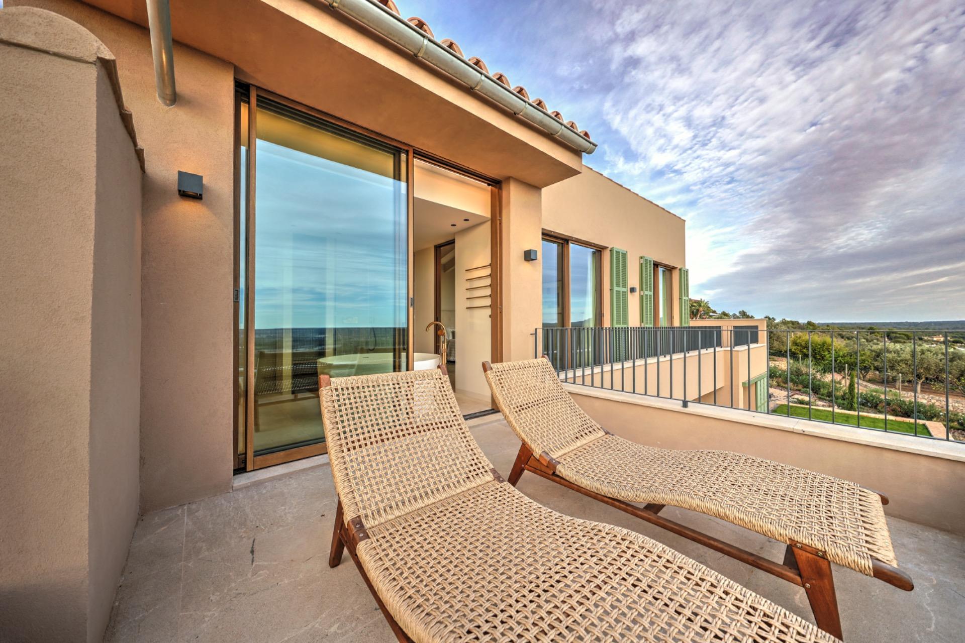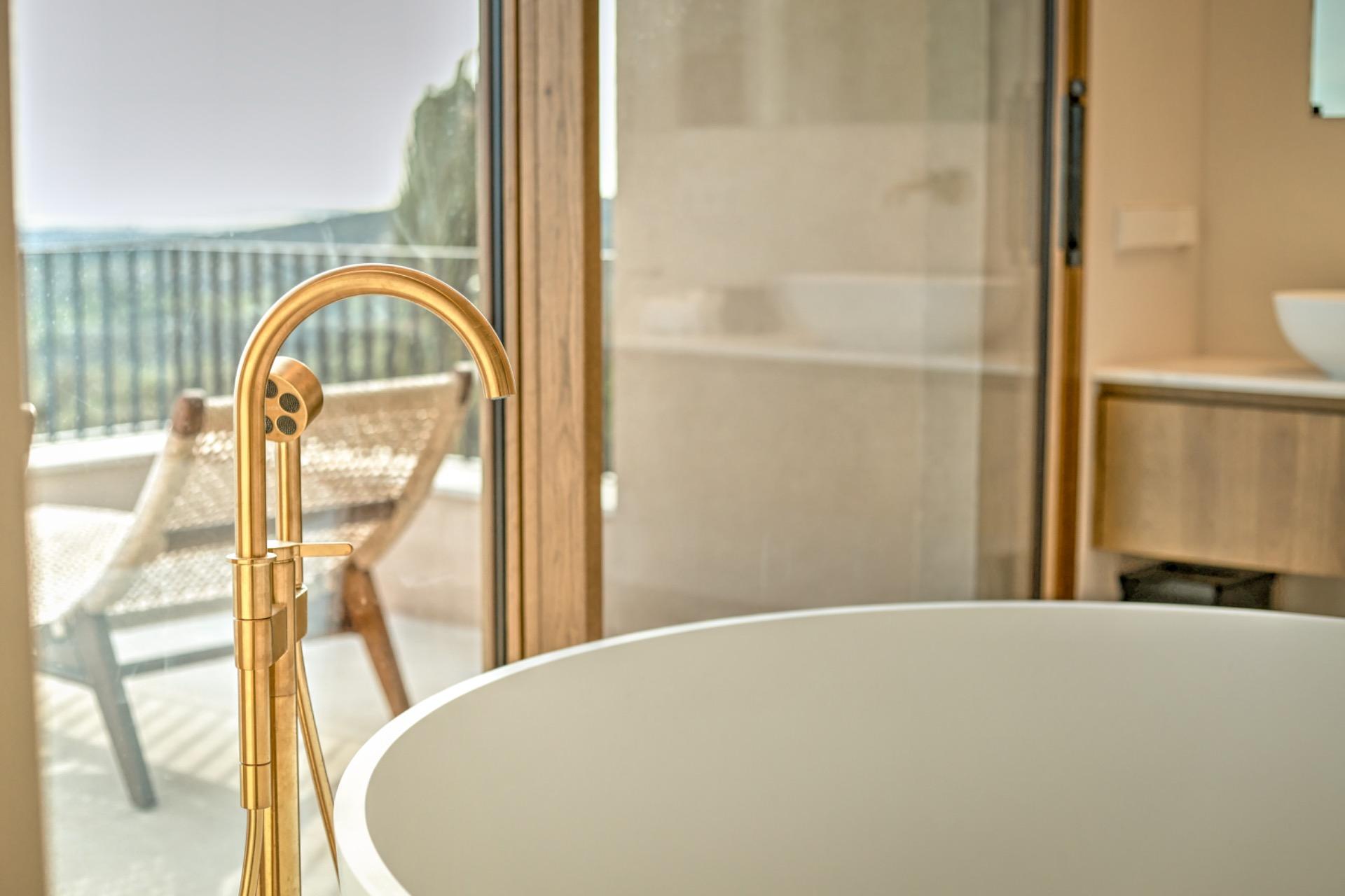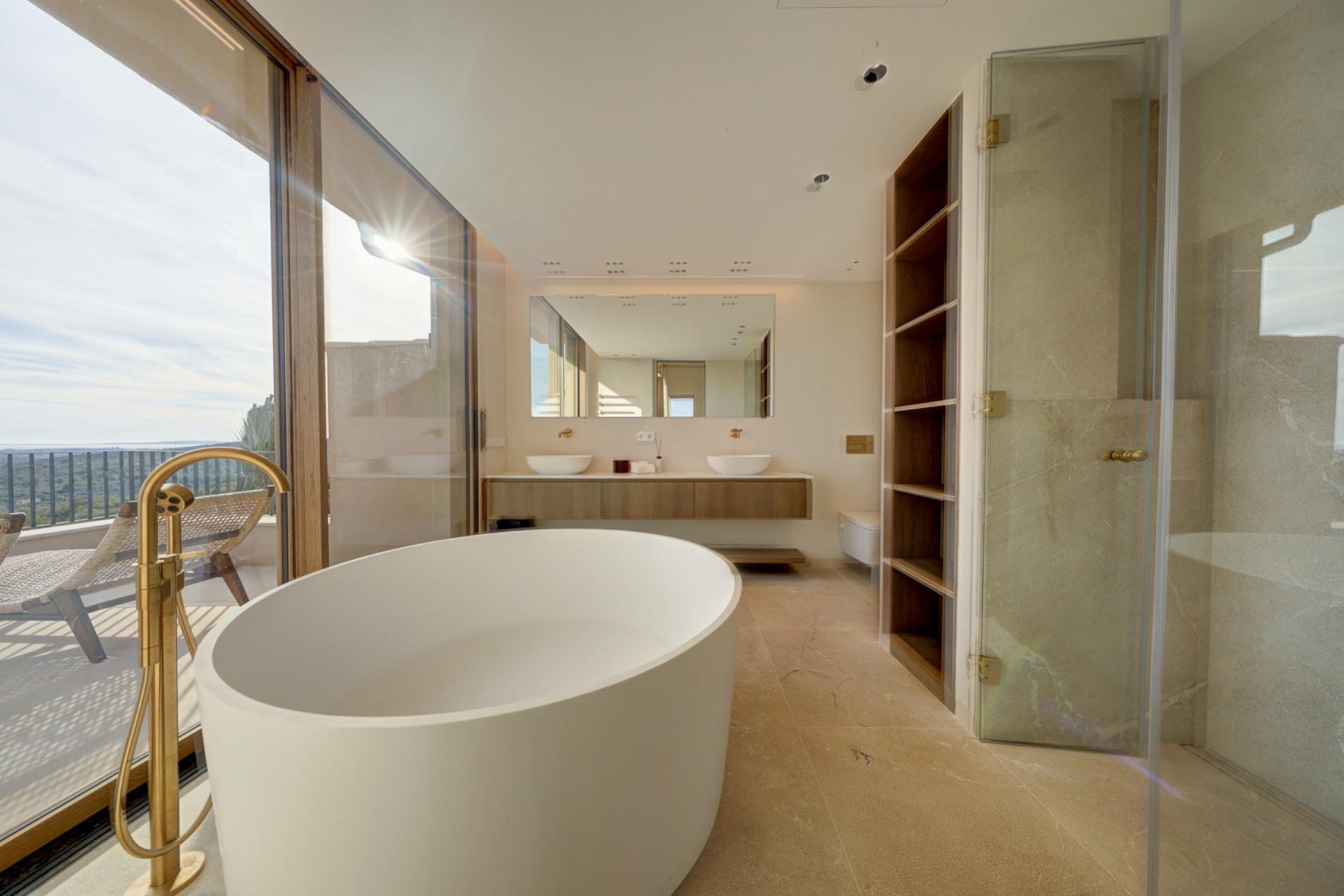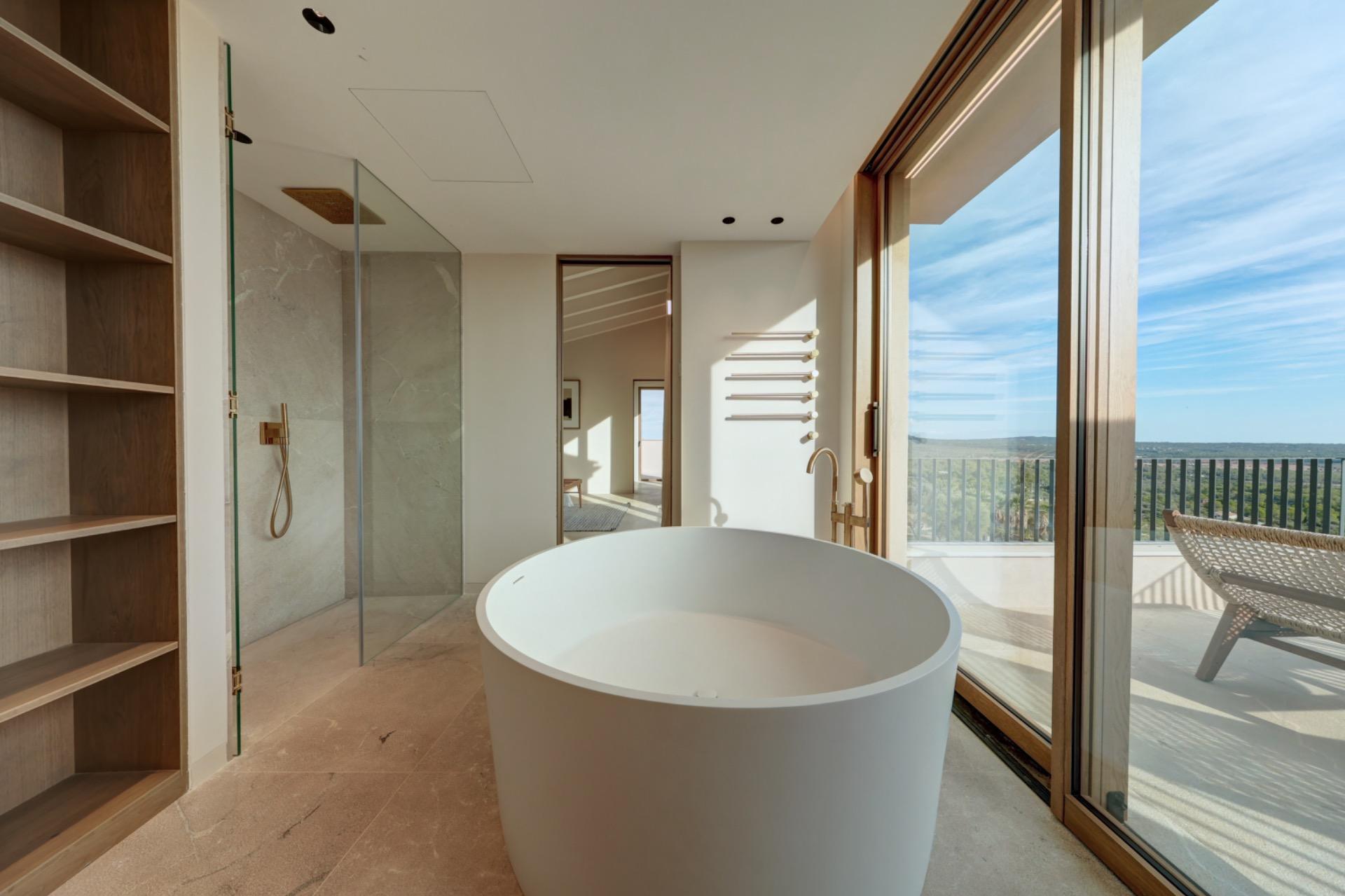 La planta superior está dedicada a la suite principal, con vestidor, baño en suite con bañera exenta y ducha independiente, además de acceso a una terraza privada con panorámicas únicas sobre el paisaje y la bahía.
