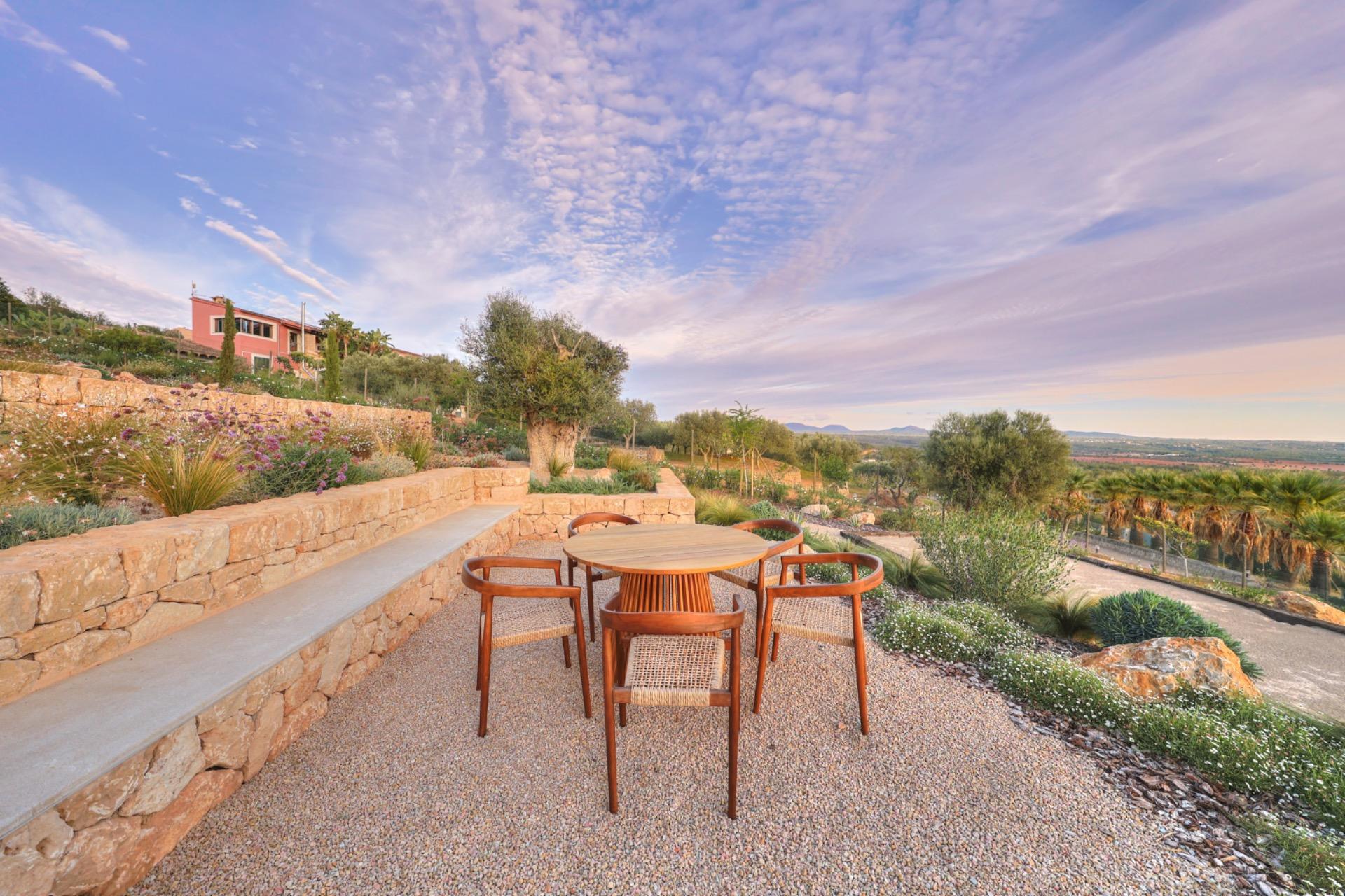 Una amplia terraza frontal de dos niveles, parcialmente cubierta, recorre la vivienda. En el nivel inferior se encuentra la piscina de 8 x 4 metros, junto a un patio con chimenea exterior, mientras que el jardín mediterráneo, con olivos centenarios, palmeras y lavanda, está delimitado por un muro de piedra natural construido a mano.